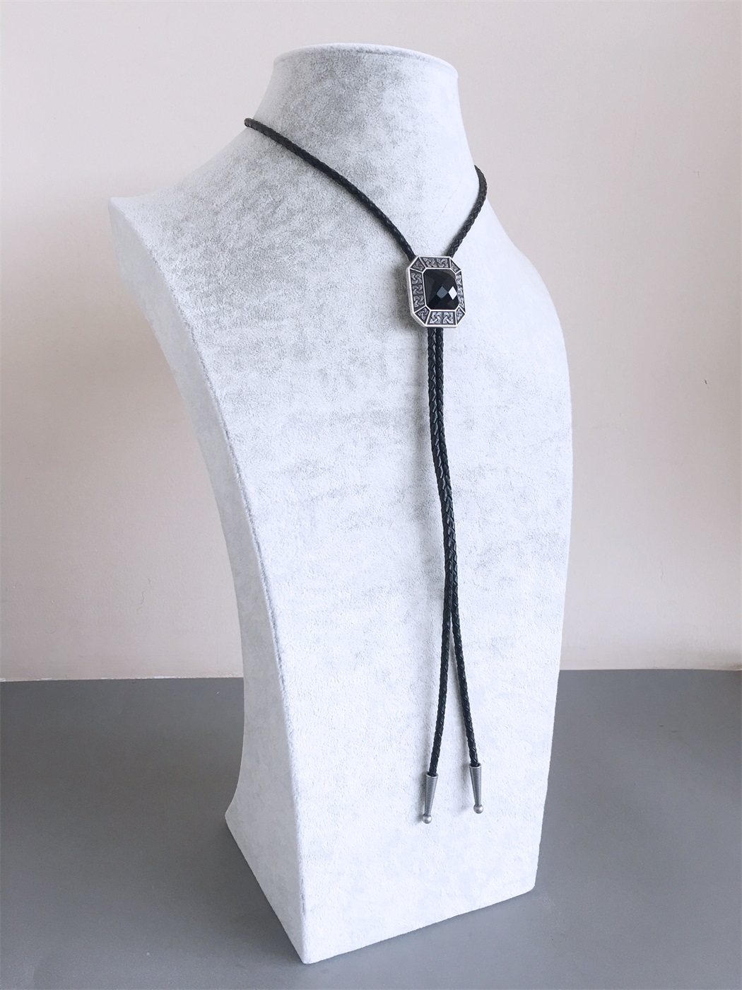 Vintage Silver Plated Black Agate Octagon Celtic Bolo Tie Leather Necklace BOLOTIE-021BK