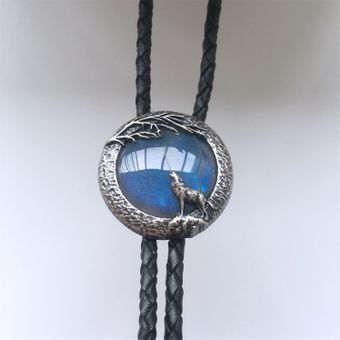 Wolf Handcraft Nature Labradorite Stone Round Wedding Men Bolo Tie BOLOTIE-048